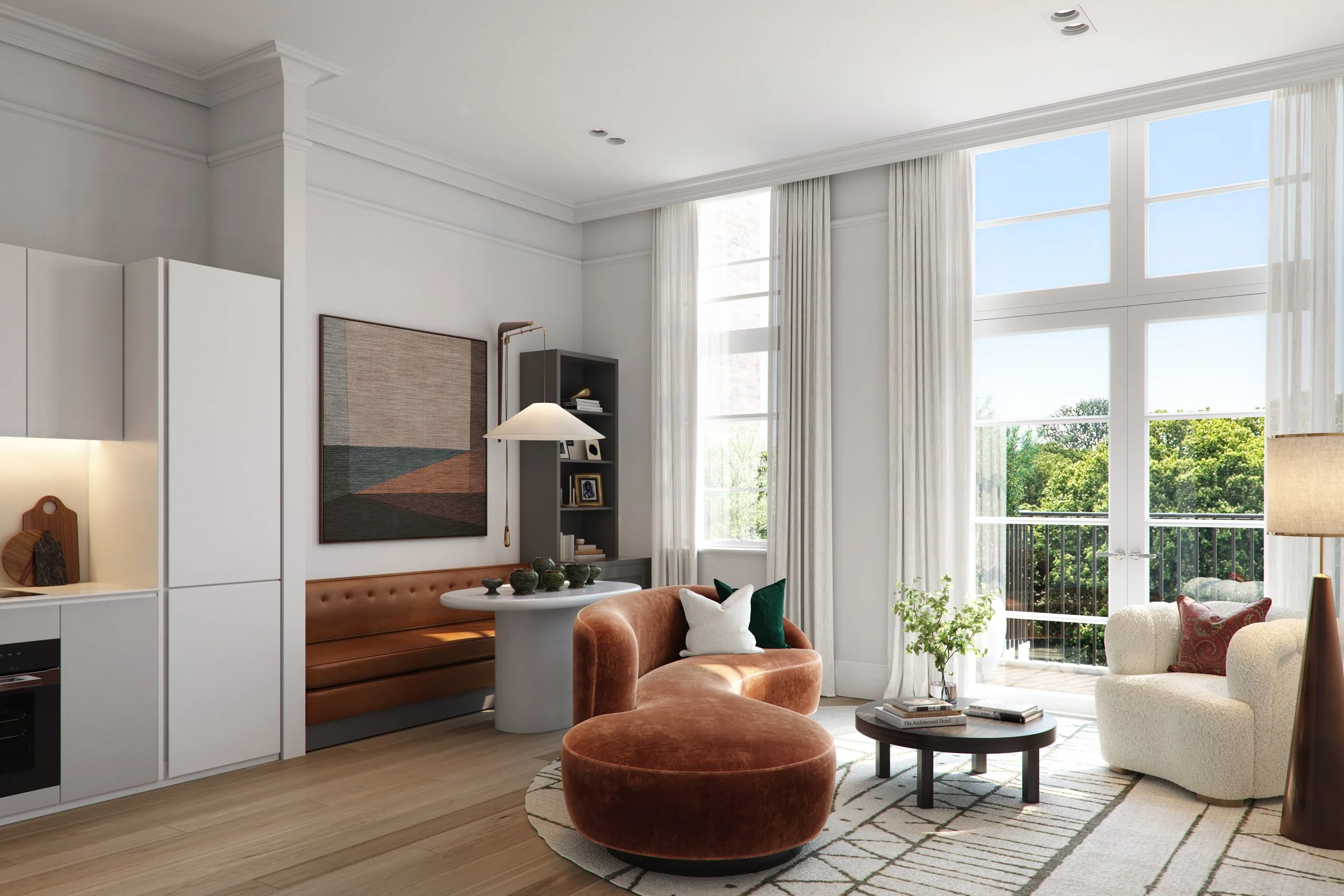 The spacious, beautifully designed open plan living space features engineered oak flooring and a sleek, handmade Italian designed kitchen. High ceilings (3.5 metres), full height windows and glazed patio doors ensure that living space is filled with natural light.