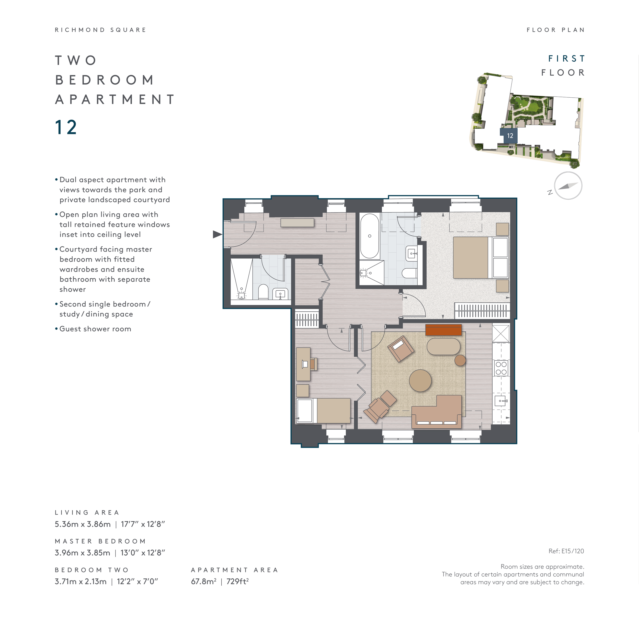 Dual aspect apartment with views towards the park and private landscaped courtyard