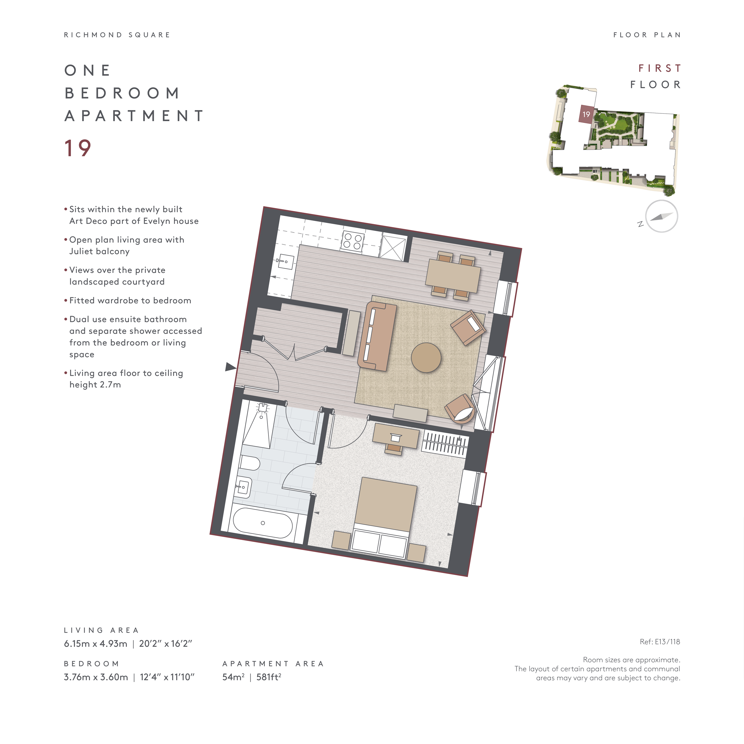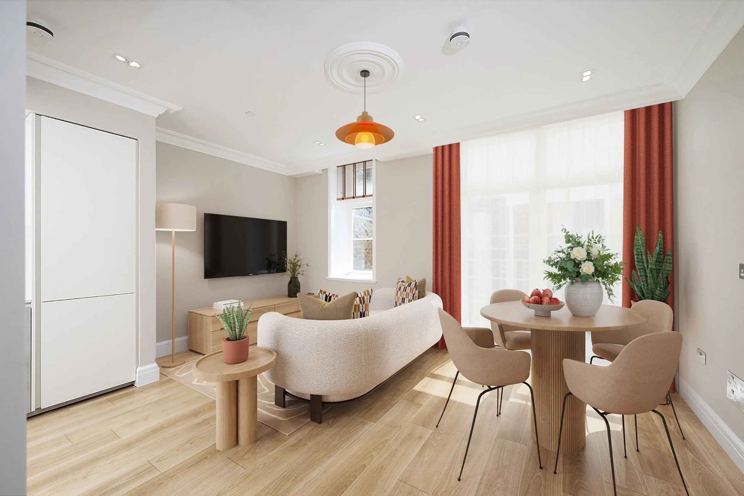 An elegantly designed one-bedroom apartment offering a bright open plan living area with a Juliet balcony and 2.7-metre ceiling height. The living space enjoys views across the private landscaped courtyard.