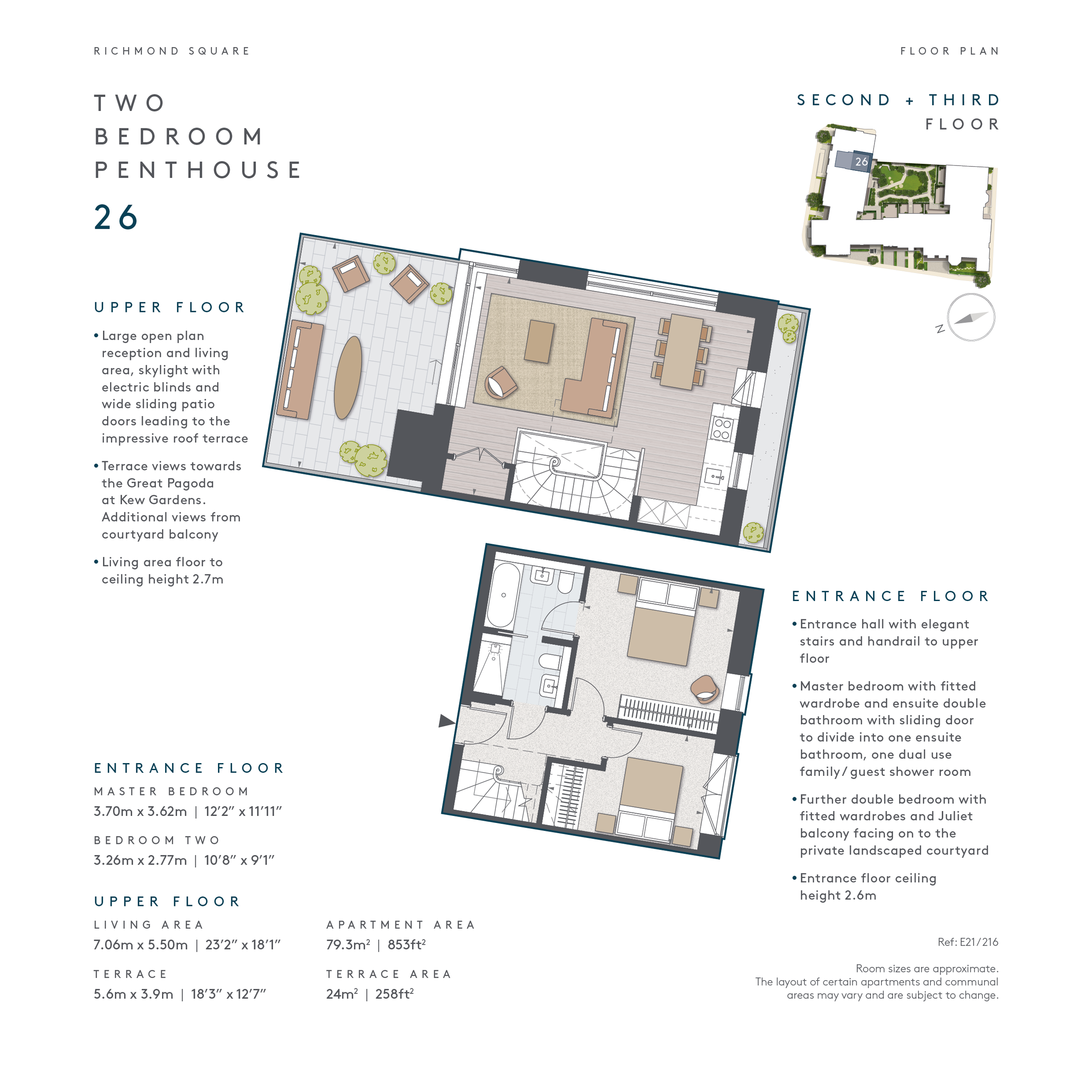 This stunning two bedroom penthouse, set over two floors, sits within the newly built Art Deco part of Evelyn house. Upon arrival the entrance hall with elegant stairs leads to the upper floor, opening onto the large open plan reception and living area, a skylight with electric blinds floods the room with light, and wide sliding patio doors lead to the impressive roof terrace with views towards the Great Pagoda at Kew Gardens. An additional balcony offers views onto the landscaped private gardens.
